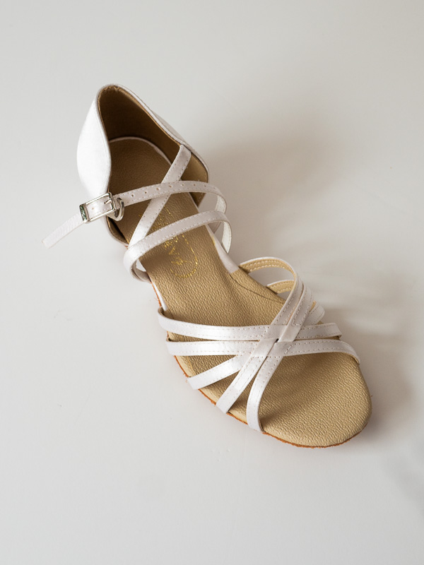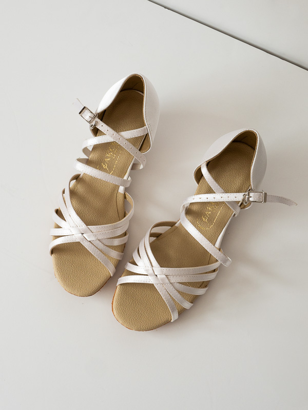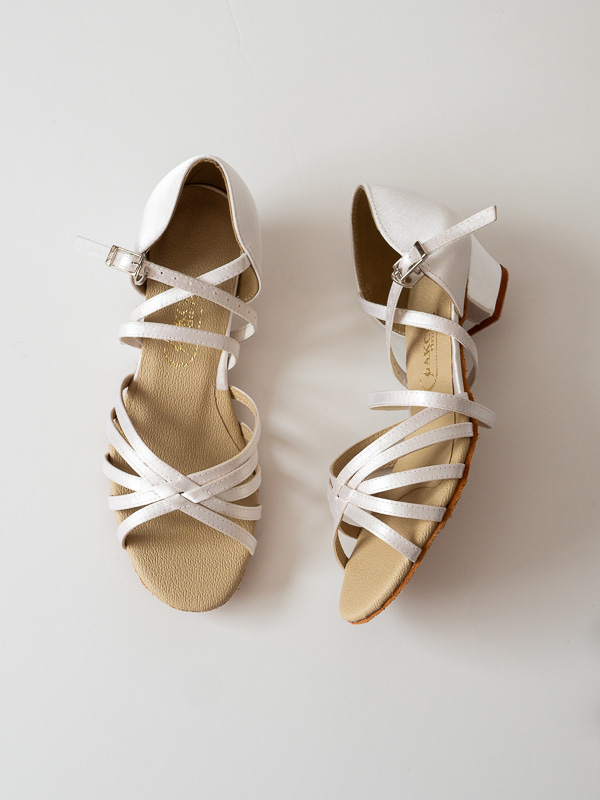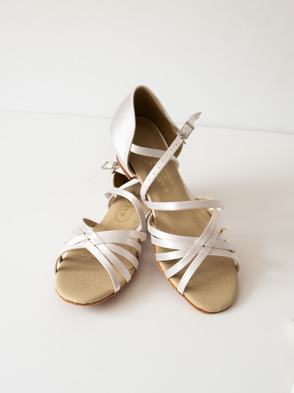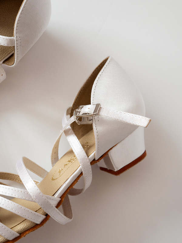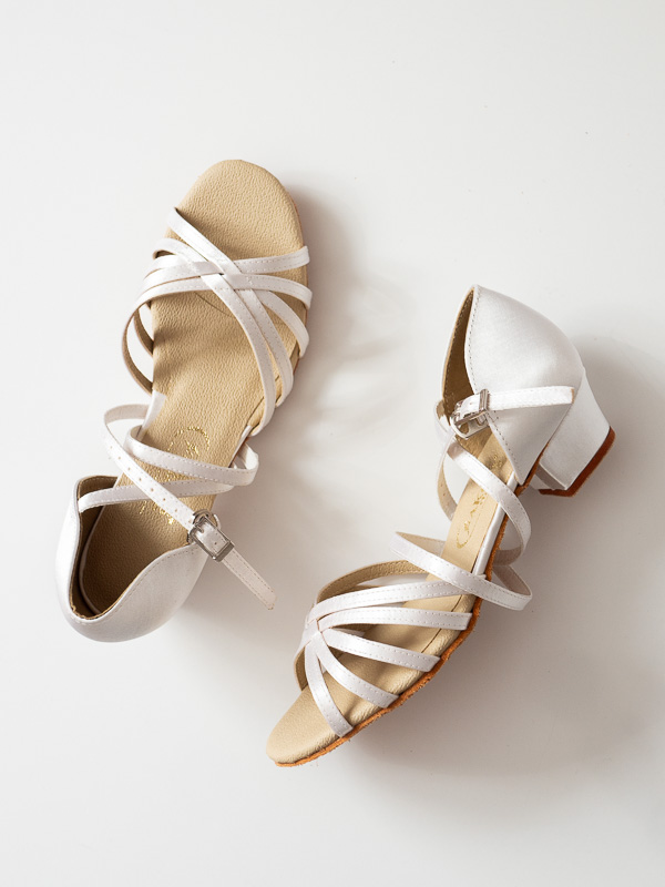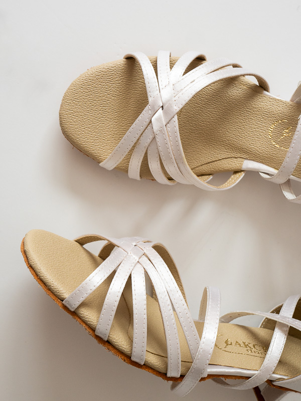 Obuwie taneczne dla dziewczynek do tańców latynoamerykańskich i standardowych – biała satyna